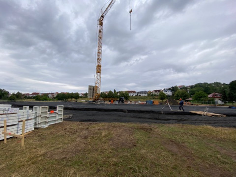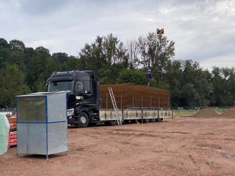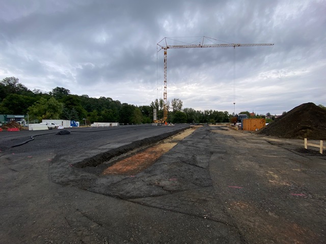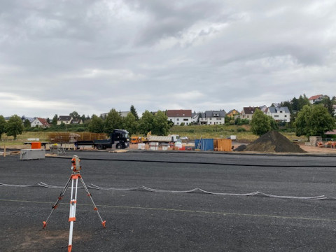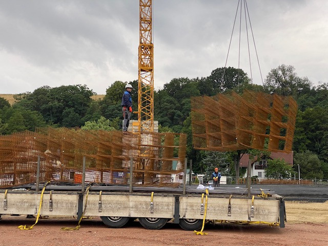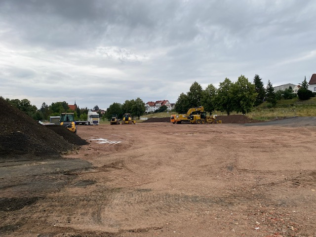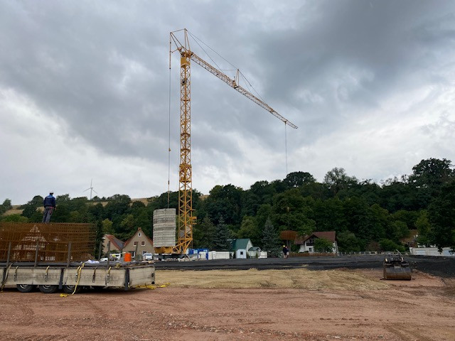 In der Frankfurter Straße in Vacha schreitet die Bauausführung gut voran. Die Firma Schneider-Systembau hat bereits die Streifenfundamente ausgehoben und die Schotterfläche für den zukünftigen Rewe-Markt hergestellt. Diese Woche haben sie mit der Schalung und Bewehrung begonnen. Die Bewehrung dient als Verstärkung für die Betonbauteile und wird eingesetzt, um die Tragfähigkeit und Belastbarkeit der Bauteile zu erhöhen. Auf den Bildern sehen Sie unteranderem die Anlieferung des Bewehrungsstahls. Im August wird das Fundament und die Bodenplatte für das Gebäude fertiggestellt und die Arbeiten am Mauerwerk starten dann. Außerdem wird die Außenanlage für den zukünftigen Parkplatz vorbereitet und geschottert.