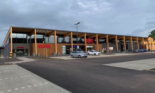 Am 22.05.2019 wurden der REWE Markt mit knapp 2.000 Quadratmetern Verkaufsfläche feierlich eröffnet. Fortan können Kunden das Einkaufserlebnis eines modernen Vollsortiment-Supermarktes genießen. Die große Fensterfront an der Stirnseite des Marktes, sowie zahlreiche Lichtkuppeln ermöglichen dabei einen angenehm hellen Innenraum mit Tageslicht und sind zugleich energieeffizient.